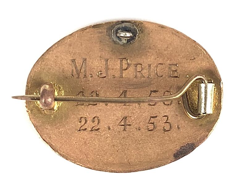 A good original 'The Royal Salop Infirmary nurses hospital gilt and enamel pin badge' in the form of a blue enamel oval title surround, the centre bearing the enamelled Arms of Shropshire with motto Floreat Salopia (May Shropshire flourish) below; the reverse inscribed to nurse ' M.J.PRICE 22.4.50. 22.4.53' Good condition, complete with original pin fittings, enamel intact with very minor service wear.