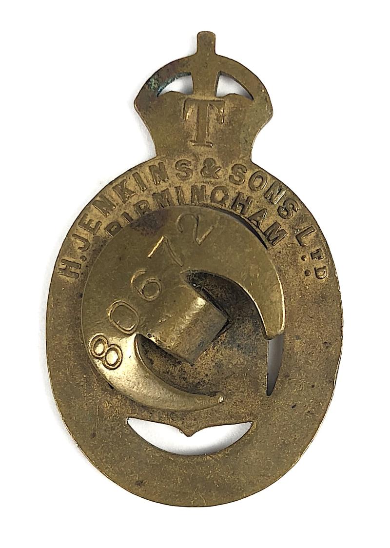 A good original First World War official War munition workers brass badge, the reverse with the SCARCE maker's details 'H.JENKINS & SONS LTD BIRMINGHAM' stamped with a 'T' and issue number '80672'. Very good condition, complete with original buttonhole fitting, toned.