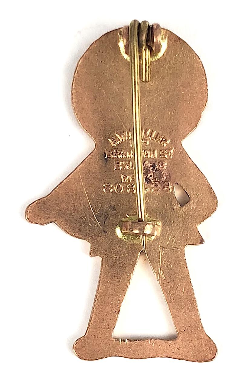 A very rare original pre-war 'Robertson's Tennis Golly badge' wearing yellow v-neck waistcoat and displaying the advertising slogan 'Golden Shred', the reverse impressed in relief with a 'REGd APPd 808488' a Registration, Design and Patent for the year 1936 and with maker's details 'H.W.Miller Ltd Branston St B'Ham.18'. Good condition, complete with original coiled pin fitting and hooked catch, minor stress mark to right leg, gilt finish remains bright.