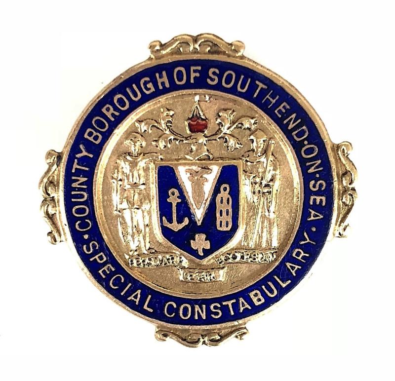A good original First World War period 'County Borough of Southend-on-Sea Special Constabulary gilt and enamel badge, bearing the Borough Council Coat of Arms' with motto 'Per Mare Per Ecclesiam' (Through the sea through the Church). Very good condition, complete with original buttonhole fitting, no stress marks or damage to the enamel.