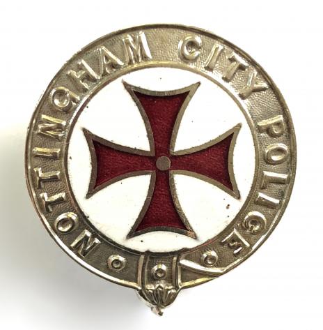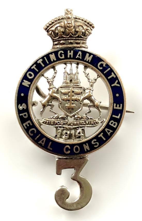 A rare original First World War period 'Nottingham City Special Constable pin badge'; nickel plated blue enamel circlet, Nottingham City Arms over '1914' to voided centre, with an additional Crown added to the top and 'Company 3' applied to the base. Good condition, complete with original pin fittings, service wear to plating.