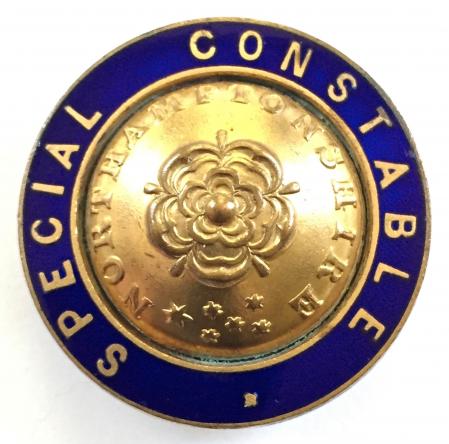 A very scarce original First World War period 'Northamptonshire Special Constable lapel badge', gilded brass circular example, blue enamel title surround, convex button style centre bearing a rose from the 'Northamptonshire County Arms'. Very good condition, retaining original substantial pin fittings, no stress marks or damage to the enamel, gilt remains fresh, an excellent example.