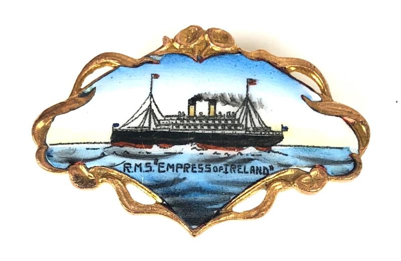 A scarce original circa 1930's period 'S.S. Empress of Canada gilt and blue enamel ships wheel souvenir pin brooch' mounted with the 'Canadian Pacific Steam Ship Company' red and white chequered flag to the centre. Good condition, complete with original pin fittings, minor enamel flaw in the 5 o'clock position, gilt finish remains bright.