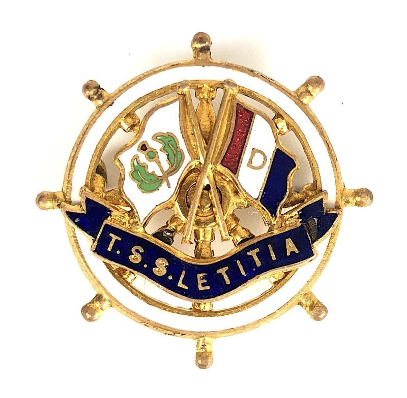 A scarce original 1932 -1940 period 'Royal Mail Lines RML Highland Patriot ship's wheel pin brooch', small size fine quality example mounted to the centre with the companies house flag; the reverse impressed with Birmingham silver hallmarks for 1932 and maker's details 'T.F'. Very good condition, complete with original pin fittings, no damage to the enamel.