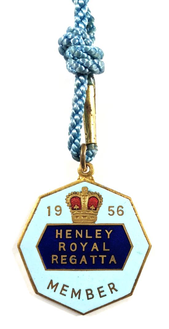 A rare original '1956 Henley Royal Regatta gilt and enamel badge', the reverse impressed with maker's details 'R.E.Pearce Henley-on-Thames' 'Not Transferable' and official issue number No 254'. Very good clean condition, no damage to the enamel and complete with original cord.