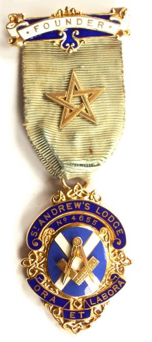 A fine quality scarce 'Upton Cross Lodge No 4454 silver gilt Founders Jewel'; enamel vignette in a temple surround, the reverse impressed with London silver hallmarks for 1922 and maker's details "Toye & Co London". Very good condition, retaining original silk ribbon (fragile) and 'Founder' suspension bar with single pin fitting, enamel perfect.