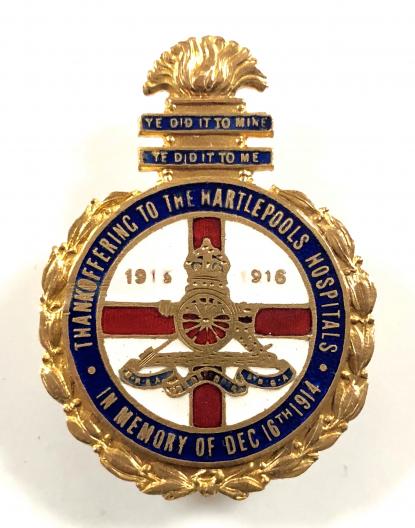 A scarce original Great War period 'Hartlepools Hospitals Bombardment Durham RGA tribute badge' circular gilded brass example, blue enamel title surround 'Thanks Giving Day In Memory of DECr 16 1914', the centre bearing Red Cross with superimposed laurel wreath on white ground. Very good condition, complete with original pin fittings, no stress marks or damage to the enamel.