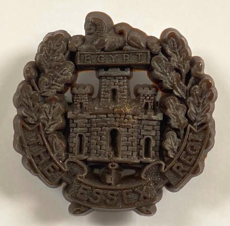 A scarce original Second World War period 'Essex Regiment dark brown plastic economy issue cap badge', the reverse with maker's details 'A.Stanley & Sons Walsall'. Very good condition, complete with original two blade fittings folded.