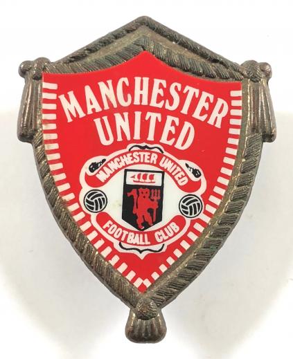 A scarce original circa 1970 'Manchester United football club badge'; large brass shield with an applied red plastic insert, the reverse impressed with maker's details 'Coffer Sports Northampton'. Very good condition, complete with original pin fittings.