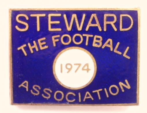 A good original 'England Football Association Steward 1974 annual identification badge', large gilded brass oblong example inlaid with dark blue enamel, inscribed 'Steward' 'The Football Association' white enamel ball bearing 1974 to the centre. Very good condition, retaining original pin fittings, enamel perfect, gilt remains fresh.