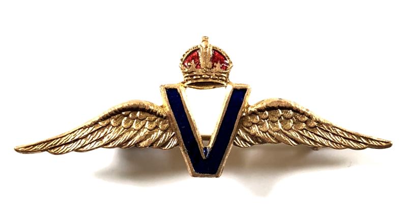 A very scarce original circa 1940's period 'Royal Air Force Victory badge' in the form of a gilt brass pilot's wing; the centre bearing a Crowned 'V' for victory symbol inlaid with blue and red enamel. Very good condition, complete with original pin fittings, no damage to the enamel, gilt finish remains bright.