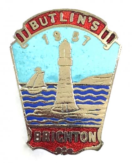 A scarce original 'Butlin's 1957 Brighton chromium plated badge' with red enamel labels, the reverse impressed with maker's details 'Jewellery Metal Co Dublin Empire'. Very good condition, complete with original pin fittings, no damage to the enamel, an excelent example.