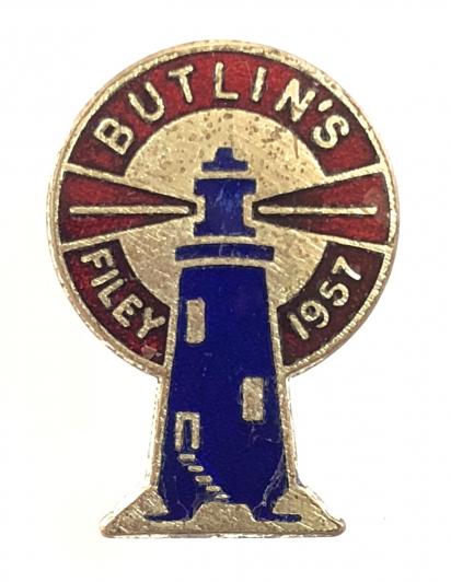A scarce original 'Butlin's 1957 Filey holiday camp silver plated badge' dark blue enamel lighthouse with red border title, the reverse impressed with maker's details 'J.R.Gaunt London'. Good condition, complete with original pin fittings, no damage to the enamel, minor wear to silver plating.