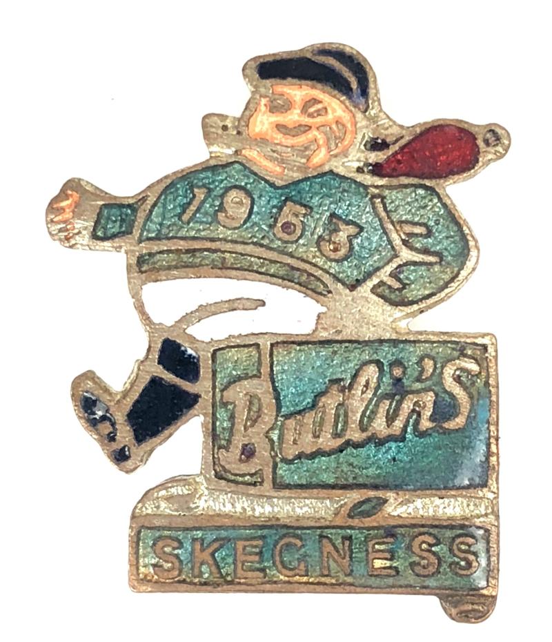 A good original 'Butlin's 1954 Skegness silver plated pin badge' with yellow enamel border, the reverse impressed with maker's details 'W.Reeves & Co Ltd Birmingham'. Very good condition, complete with original pin fittings, no stress marks or damage to the enamel.