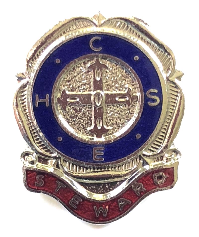 A scarce original 'Royal College of Nursing Steward Union badge'; yellow chromium plated rectangle example bearing stylised hands on white enamel ground. Very good condition, complete with original pin fittings, safety roller catch in good working order, no damage to the enamel.