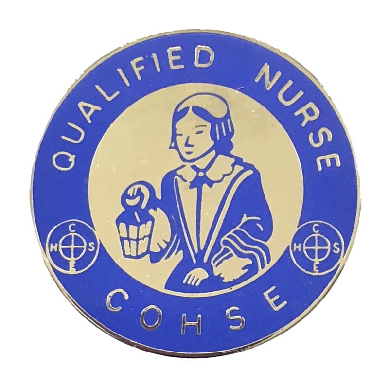 A good original 'Royal College of Nursing union membership badge'; chromium plated rectangle example bearing blue and red enamel stylised hands on white matt ground. Very good condition, retaining original pin fittings, no damage to the enamel.