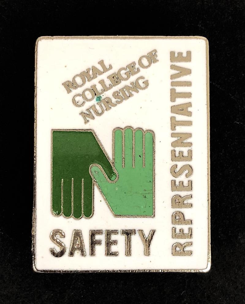 A good original 'Royal College of Nursing Safety Representative union pin badge'; chromium plated rectangle example bearing blue and green enamel stylised hands on white enamel ground. Very good condition, complete with original pin fittings, no damage to the enamel.