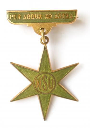A rare turn of the twentieth century badge for the 'Nurses Social Union', a gilt six pointed star inlaid with green enamel with the letters 'NSU' in a circle to the centre and suspended from a bar with the unions motto 'Per Ardua Ad Astra', the reverse with maker's details to both parts "W.O.Lewis Howard St Birmn." Very good condition, retaining original pin fittings, no damage to the e... read more