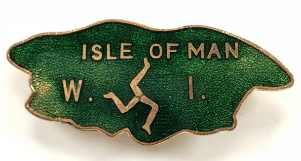 A very stylish post-1950's 'Isle of Man Federation of Women's Institutes membership badge'; large gilded metal example in the form of the islands distinctive vertical shape, bearing the ancient symbol a "Triskele" to the top on green enamel ground. Very good condition, complete with original pin fittings, no damage to the enamel.