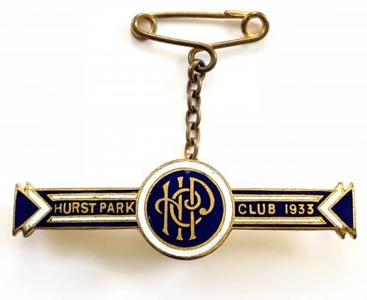 A rare original early 20th century period '1924 Hurst Park Club ladies pin badge' gilt and enamel example the reverse impressed '1924' official low issue number '99' and maker's details 'Lowe Grafton Steet London. W.'. Very good condition, complete with original pin fittings and safety chain, no stress marks or damage to the enamel, gilt finish remains bright. read more