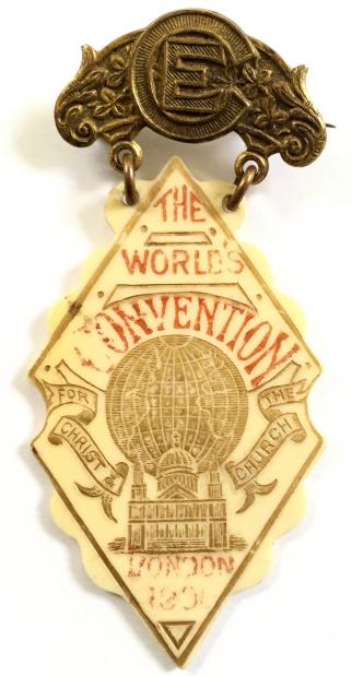 A very scarce original late Victorian period 'Christian Endeavour 19th World Convention London 1900 delegate's badge'; brass suspension bar bearing the 'CE' logo from which depends a thin composite diamond shaped pendant impressed with the globe over 'St Paul's Cathedral' and inscribed "For The Christ & Church" and infilled with gold leaf, further inscribed with red transfer "The World'... read more