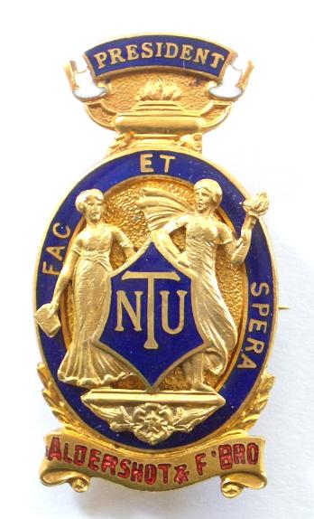 A very good quality, unmarked possibly silver gilt pre 1974 'National Union of Teachers badge'; oval bearing Latin motto 'Fac et Spera' (Do and hope), mounted by a 'Lamp of Knowledge' with 'President' scroll above and further scroll to the bottom 'Aldershot & F'Bbo' the applied central device depicting two figures supporting a shield with 'NUT' to the center, the badge is complete with red, whi... read more
