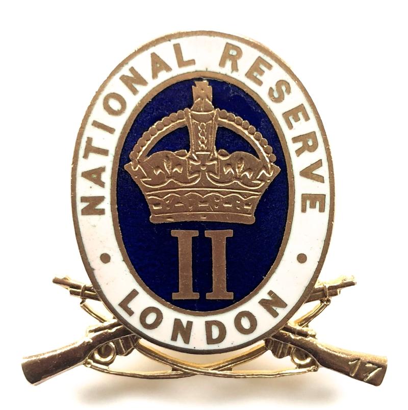A scarce original First World War period 'National Reserve Class II large gilt badge inlaid with blue and white enamel, with '1' impressed to the right side rifle butt, the reverse with maker's details 'J.R. Gaunt London' and official register number '37979 London'. Very good condition, complete with original buttonhole fitting, no damage to the enamel, gilt finish finish remains bright.