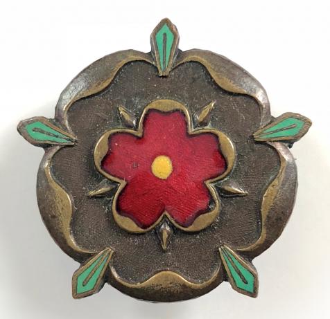 A good original 'Girl Guides County Lancashire North West badges' comprising a brass and red enamel rose and an early cloth cotton ribbon version. Good condition, complete with original pin fittings, no damage to the enamel, but with dark tinge to the centre.