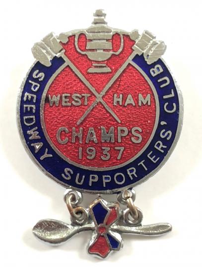 A scarce original 'West Ham Hammers Champs 1937 Speedway motorcycle badge', chromium plated enamel example with additional dangling spoon below. Very good condition, complete with original buttonhole lapel fitting, no damage to the enamel.