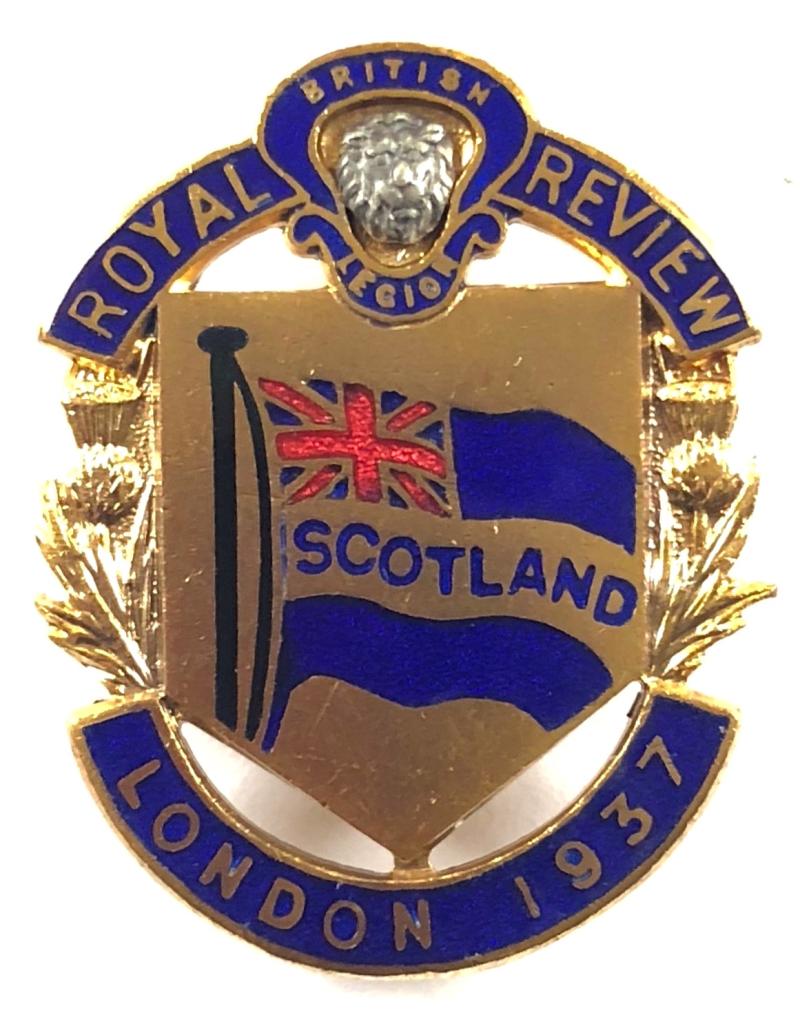 A very scarce original period 'British Legion Royal Review London 1937 commemorative pin badge'; gilt oval blue enamel title surround, the sides displaced with 'Scottish Thistles', the voided centre with shield bearing an enamelled 'British Legion Standard' with central band 'SCOTLAND'. Very good condition, complete with original pin fittings, no damage to the enamel.