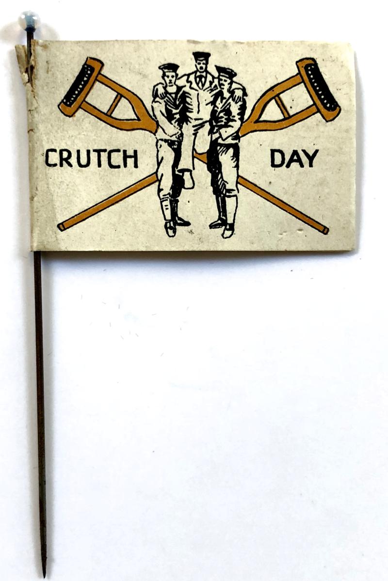 A scarce original First World War period 'Crutch Day fundraising paper flag day badge', the reverse inscribed 'FUND FOR OUTINGS FOR WOUNDED SOLDIERS' 'THANK YOU Secretary Pastor John Stanley 71 St George's Sq. Westminster'. Good condition, complete with pin, minor service wear.