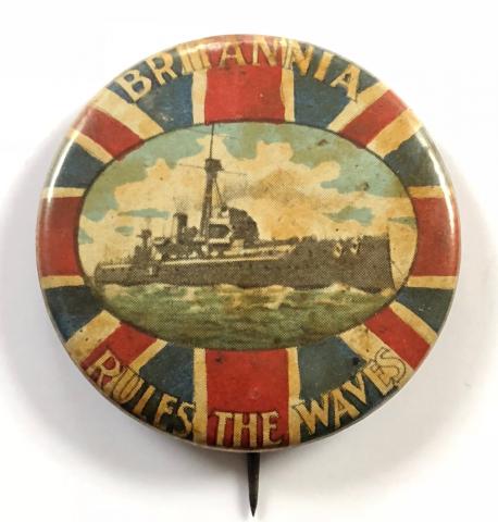 A scarce original First World War period large celluloid tin button badge, depicting a vignette of a Royal Navy Battleship within 'British Union Flag' surround and bearing the legend 'Britannia Rules The Waves'. Good condition, complete with original pin fitting, minor foxing, rust to reverse, colour remains bright.