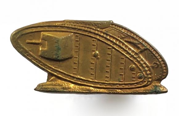 A scarce original Great War period fundraising badge, in the form of a pressed gilt brass representation of a British Army Tank. Very good condition, complete with original safety style pin fitting.