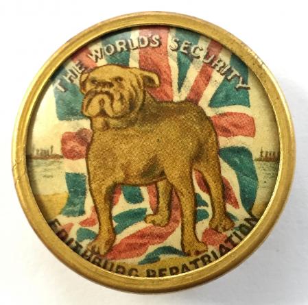 A superb example of a Great War period large gilded brass celluloid badge, sold in aid of the 'Repatriation Day Fund', depicting a 'British Bulldog' in the fore standing guard over the 'Union Flag' with the captions "The World's Security Edithburg Repatriation" with Royal Australian Navy battleships in the background. Excellent condition, retaining original pin fitting, no foxing or rust, colou... read more