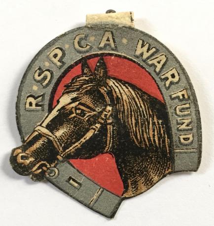 A good original First World War period 'R.S.P.C.A. fundraising badge', depicting a horses head within a horseshoe inscribed 'RSPCA War Fund' Good condition, retaining original pin fitting, colours remain bright, minor age wear, creases.