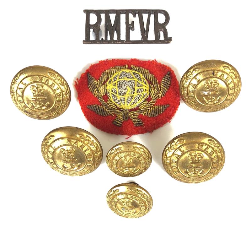 A good original post 1953 EIIR gold bullion officers single collar badge plus four large brass buttons by Firmin and two small brass by Gaunt London, together with a bronze RMFVR Royal Marine Forces Volunteer Reserve shoulder title. All in Very good condition. read more