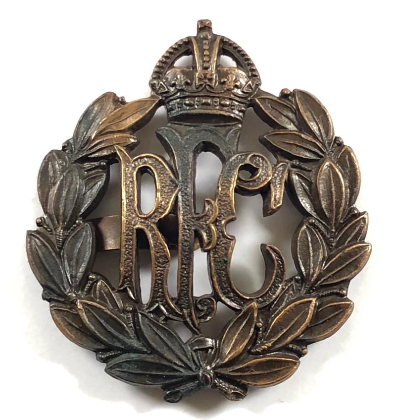 A scarce original First World War period 'Royal Flying Corps sweetheart brooch or lapel pin badge', gilt Crowned wreath 'RFC' to voided centre 'Per Ardua Ad Astra' (Through Adversity to the Stars) blue enamel scroll below. Good condition, complete with original pin fittings, no enamel loss, minor service wear.