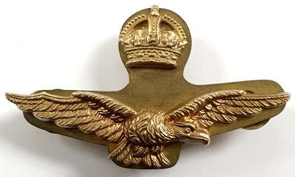 A very good original King George VI period two piece RAF officer's gilded brass cap badge on backing plate, retaining the original screw posts and nuts to both Crown and eagle. Very good condition, minimal service wear.