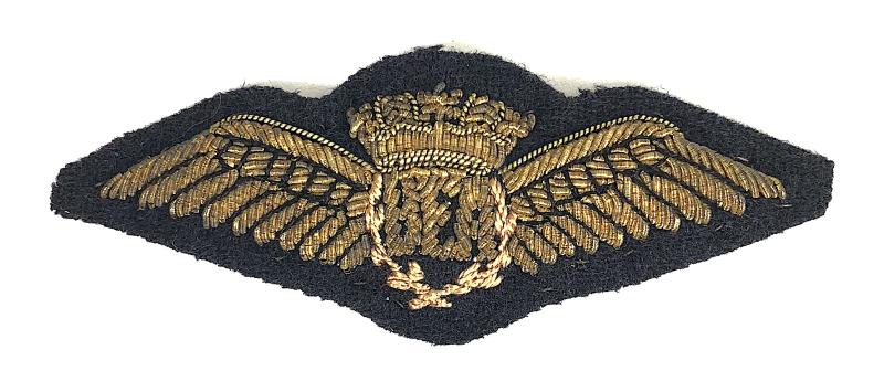 A good original circa 1970's 'British Airways pilot's wing badge', large gold bullion embroidery wings on felt cloth backing, the padded centre bearing 'British Airways Coat of Arms', surmounted by an astral crown, the reverse with paper lined black hessian backing. Very good used condition, bullion remains bright.