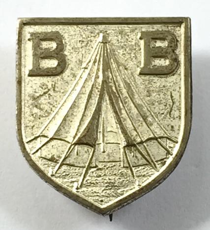 A good scarce 'Boys Brigade Campers Proficiency die-cast chromium plated badge' depicting a bell tent with extra guy ropes, this example with large flat 'B's'. Very good condition, retaining original horizontal tube joint pin fitting and rounded catch.