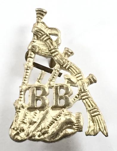A scarce original circa 1940's 'Boys Brigade pipers proficiency badge', a frosted silver example with single piercing to longest drone, semi-circular piercing to the B's. Very good condition, retaining original tube pin fittings and rounded catch, an excellent example.