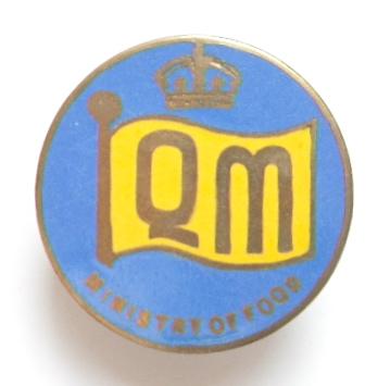 A scarce wartime 'Queen's Messenger Ministry of Food' good quality unmarked silver badge, the Crowned flag bearing a "QM" and inlaid with yellow enamel, set against a light blue enamel backing, the reverse with indistinct maker's details. Good condition, retaining original pin fittings, no damage to the enamel, minor surface scratches.