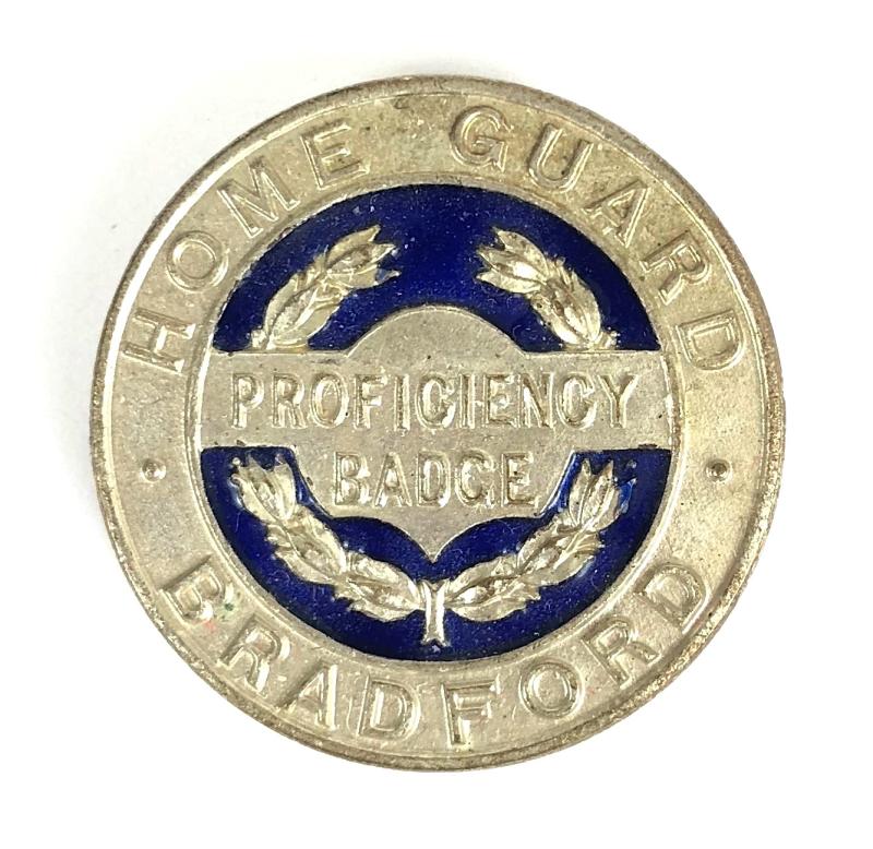 A good original wartime issue 'Bradford Home Guard uniform badge', circular nickel silver plated example with blue enamel centre and an embossed bar over laurel sprays inscribed 'PROFICIENCY BADGE', the reverse impressed with maker's details 'Fattorini Bradford' and two original loop fittings north and south with retainer split pin indicating a style of badge worn on a sleeve. Good condition, n... read more