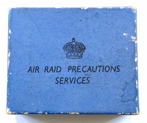 A scarce original wartime period 'Air Raid Precautions Services blue square cardboard box. CONDITION: one split to corner on lower half, three splits to corners on upper half, scuffs, scratches with overall service wear. Colour may vary slightly on photograghs.