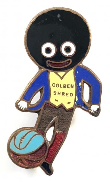 A rare original pre-war circa 1937 first pattern 'Robertson's Footballer Golly badge', displaying white hands and black feet and wearing a yellow V-neck waistcoat displaying the advertising slogan 'Golden Shred' and kicking a black and white ball; the reverse stamped in relief with a "REGd 808442" a Registration, Design and Patent for the year 1937 and with maker's details "H.W.Miller Branston ... read more