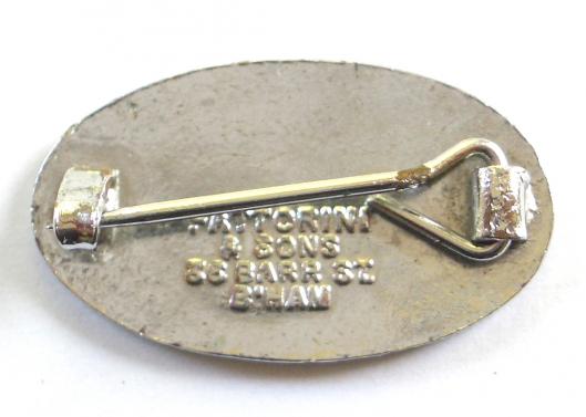 A good circa 1960's 'National Union of Mine Workers, North Western Area' chromium plated badge; oval example with title band inlaid with red enamel, the centre depicting a miner's helmet amd pick in front of pithead, the reverse with maker's details "Fattorini & Sons 36 Barr St. B'Ham". Good condition, retaining original pin fittings, no damage to the enamel.