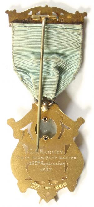 A fine quality scarce 'Masonic Founder Jewel' for the 'Lloyds Lodge No 5673', the very ornate jewel bearing a superb hand painted enamelled galleon within a shield, with 'Globe' above; the reverse impressed with Birmingham silver hallmarks for 1937, maker's details "Spencer London" and inscribed "C.A.Harvey First IMMD. Past Master 23rd September 1937". Very good condition, retaining original silk ribbon and suspension bar with single pin fitting, perfect enamel, complete with original gilt finish.