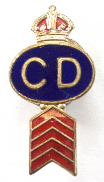 A good original wartime period 'Civil Defence badge' small silver plated oval with "C D" on blue enamel ground surmounted by a King's Crown, with additional red enamel inverted chevrons below representing five years service. Very good condition, retaining original buttonhole fitting, enamel loss to top stripe otherwise perfect.