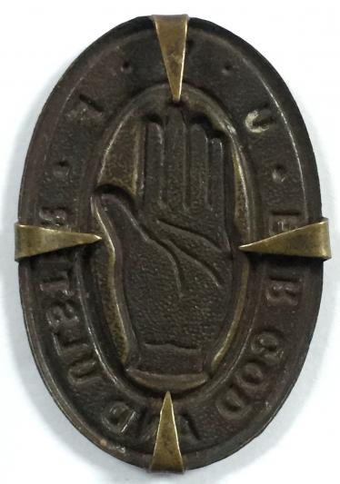 A scarce original circa 1913 -1914 period 'Ulster Volunteer Force cap badge' die-stamped bronze example, displaying the 'Red Hand of Ulster' within an large upright oval inscribed U.V.F. For God and Ulster this incorporating four triangular blade fittings to the rim. Very good condition, minimal wear, excellent patina.