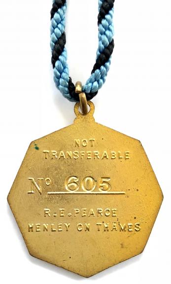 A rare original '1958 Henley Royal Regatta gilt and enamel badge', the reverse with maker's details "R.E.Pearce Henley-on-Thames" "Not Transferable" and official issue number "605". Very good clean condition, enamel perfect and complete with original cord.
